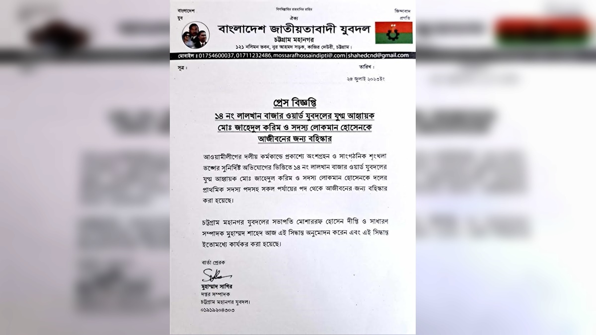রোববার (২৪ জুলাই) মহানগর যুবদলের দপ্তর সম্পাদক মুহাম্মাদ সাগিরের সই করা এক সংবাদ বিজ্ঞপ্তিতে বিষয়টি জানানো হয়।