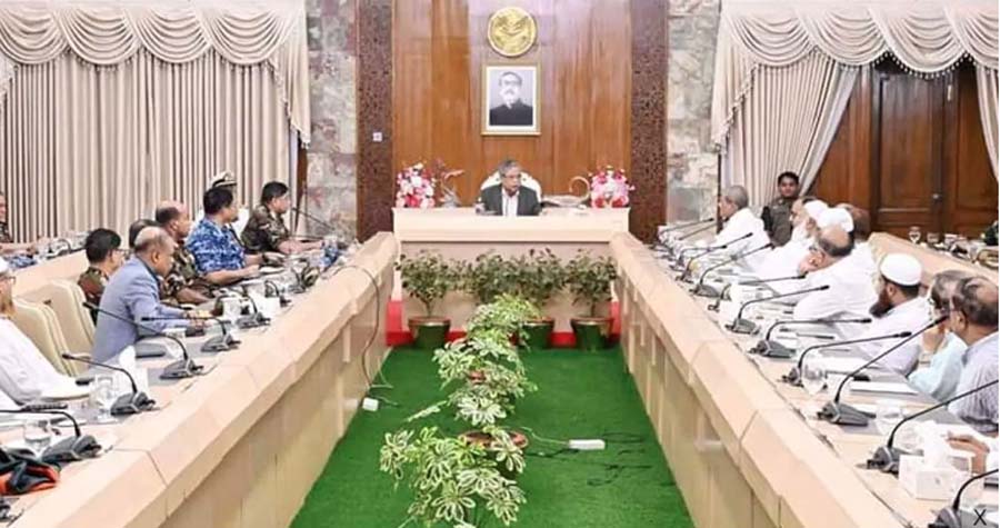 বর্তমান পরিস্থিতি ও অন্তবর্তীকালীন সরকারের রূপরেখা নিয়ে বঙ্গভবনে প্রেসিডেন্টের সঙ্গে বৈঠক করছেন বৈষম্যবিরোধী ছাত্র আন্দোলনের ১৩ সদস্যের একটি দল। এই বৈঠকে তিন বাহিনীর প্রধানরাও উপস্থিত রয়েছেন। মঙ্গলবার সন্ধ্যায় এই বৈঠক শুরু হয়। বৈষম্যবিরোধী ছাত্র আন্দোলনের অন্যতম সমন্বয়ক মো. নাহিদ ইসলাম গণমাধ্যমকে বিষয়টি জানান। তিনি আরও জানান, বৈঠকে আরও উপস্থিত আছেন ঢাকা বিশ্ববিদ্যালয়ের আইন বিভাগের অধ্যাপক আসিফ নজরুল এবং একই বিশ্ববিদ্যালয়ের আন্তর্জাতিক সম্পর্ক বিভাগের অধ্যপক তানজীমউদ্দীন। আলোচনা শেষে বিস্তারিত জানানো হবে।