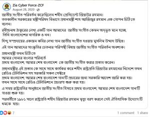 জাতীয় সংগীত পরিবর্তন করা নিয়ে, একটি অসত্য তথ্য সংবলিত লেখা শহীদ রাষ্ট্রপতি জিয়াউর রহমান বীর উত্তম কে জড়িয়ে, সামাজিক যোগাযোগ মাধ্যমে ছড়িয়ে পরেছে। যাতে দেখা যায় zia cyber force- zcf নামের একটা পেজ থেকে পোস্ট করা হয়েছিল, পরবর্তী তে তা মুছে দিয়েছে।