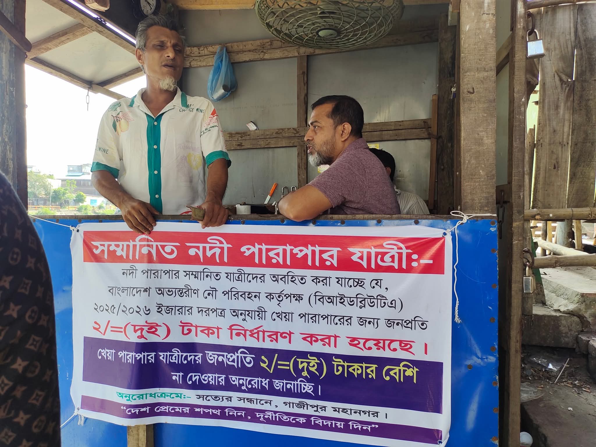 এখানে ডেস্কের সামনে একটা ব্যানার টানানো! ব্যানারে সুন্দর করে লেখা খেয়া পারাপারে প্রতিজন ২ টাকা করে। কিন্তু যখন তাদের সামনে গেলাম, তারা ৫ টাকার নিচে কোনোভাবেই নিবে না। ২ টাকায় নৌকায় উঠাবে না। তাদেরকে জিজ্ঞেস করলাম ২ টাকা কি এমনিতেই দিছি? এখানে তো লেখাই আছে প্রতিজন ২ টাকা করে! তখন তারা বললো যে এটা হুদায় লাগায় দিয়ে গেছে। সত্যের সন্ধ্যানে নামক সংগঠন থেকে এই ব্যানারটি লাগিয়ে দিয়ে গেছে। এটা তারা মানে না, ২ টাকায় তাদের নৌকায় উঠাবে না। তিনজন গেছিলাম জরুরি কাজে, ১৫ টাকা নিয়ে তারপর যেতে দিছে। তাদের সাথে বেশি কথা কাটাকাটি করি নাই কারন আমরা একটা জরুরি কাজে যাচ্ছিলাম। এখন কথা হচ্ছে যদি ৫ টাকাই দেওয়া লাগে তাহলে এখানে ২ টাকা লেখা ব্যানার কেন টানিয়ে রাখসে?? এই ব্যানারের তো কোনো মূল্য নেই, ছিঁড়ে ফেলে দিলেই তো হয়। আর যদি সত্যের সন্ধানে থেকে এই ব্যানার লাগিয়ে দিয়ে যায় তাহলে কি তারা মনে করে একটা ব্যানার লাগালেই সেখানে দূর্ণীতি বন্ধ হবে?? সঠিক তদন্ত করতে না পারলে তাদের এই ব্যানার সরিয়ে ফেলার অনুরোধ করছি! আর যদি সবাই মনে করেন এই বিষয়টি নিয়ে কথা বলা দরকার, তাহলে যে যেভাবে পারেন পোস্ট টা সব গ্রুপে ছড়িয়ে দিন কপি পেস্ট করে। অন্যায় ১ টাকার হলেও সেটা অন্যায়।