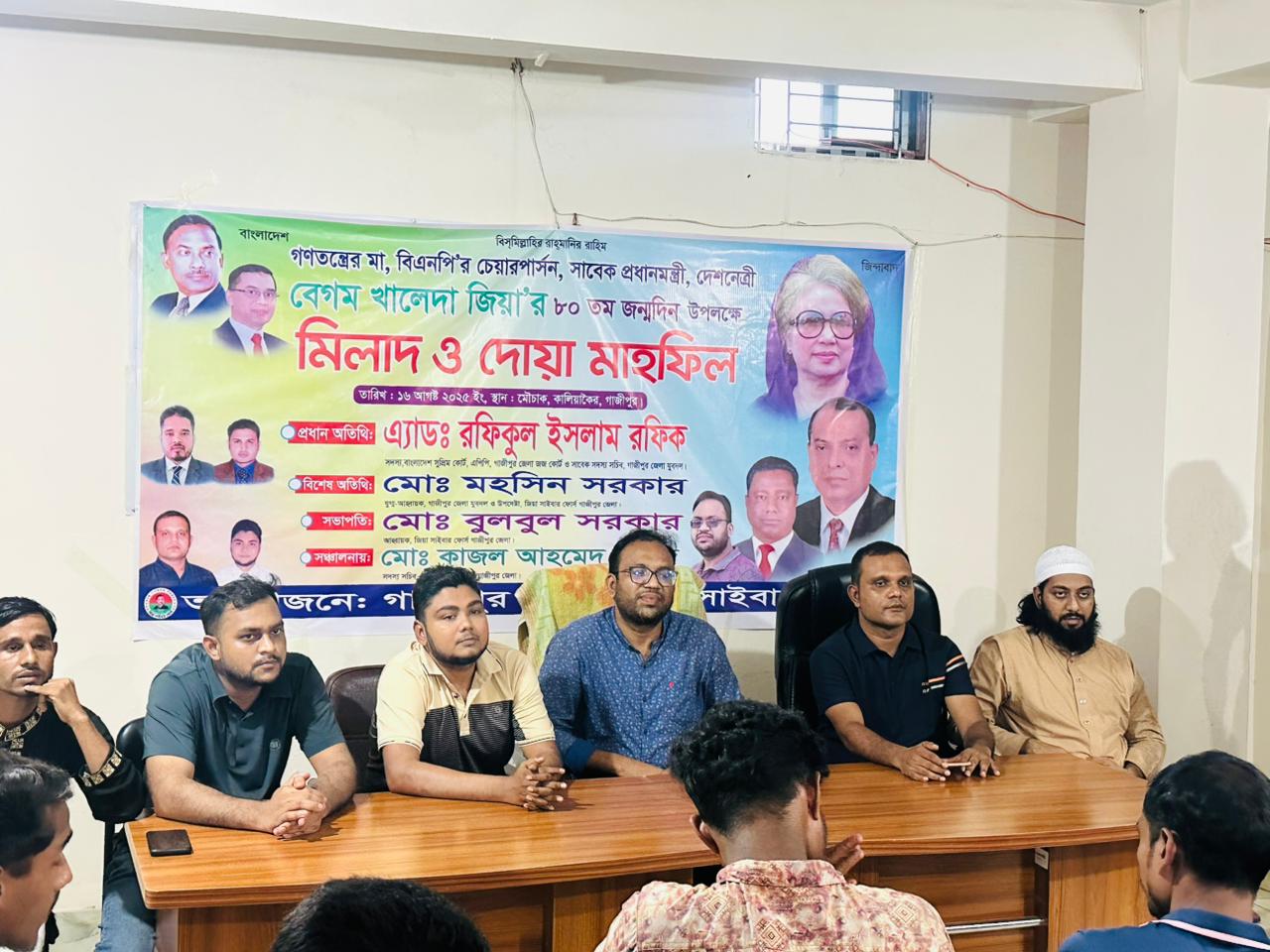 বিএনপি চেয়ারপার্সন বেগম খালেদা জিয়া’র ৮০তম জন্মদিন উপলক্ষে তার দীর্ঘায়ু ও সুস্বাস্থ্য কামনায় দোয়া মাহফিলের আয়োজন করেন গাজীপুর জেলা জিয়া সাইবার ফোর্স।